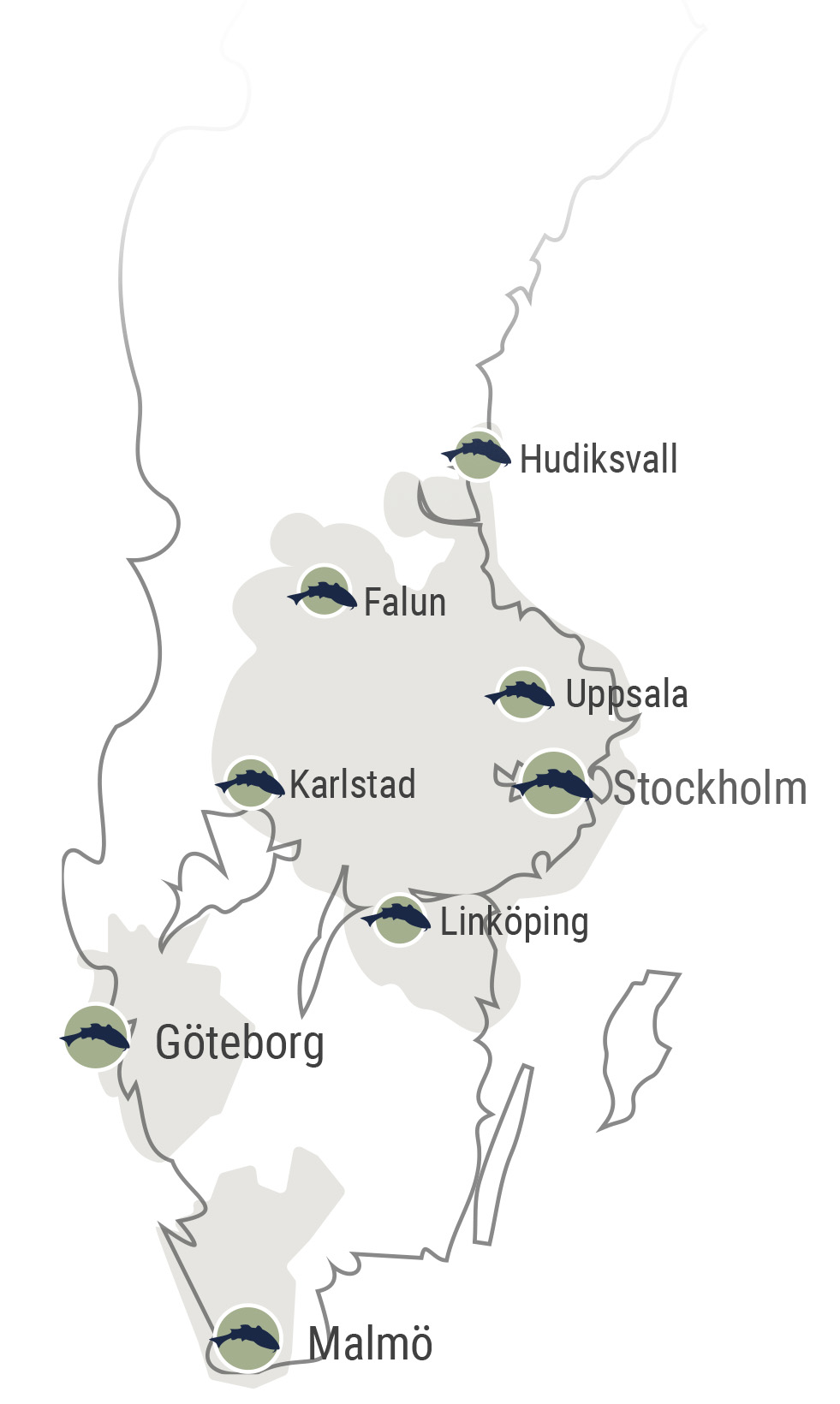 Vi finns representerade i Östergötland, Närke, Värmland, Dalarna, Uppland och Södermanland. Du kan köpa fisk & skaldjur med hemleverans till: Adelsö, Alfta, Almunge, Alunda, Ankarsrum, Arboga, Arlandastad, Arvika, Askersund, Aspabruk, Avesta, Bagarmossen, Bandhagen, Bergby, Bergshamra, Bestorp, Bettna, Björklinge, Björkvik, Björkö, Björnlunda, Blackstad, Blidö, Bollnäs, Borensberg, Borlänge, Boxholm, Brandbergen, Brevens Bruk, Bro, Bromma, Brottby, Brunskog, Bålsta, Bälinge, Dalarö, Danderyd, Degerfors, Deje, Djurhamn, Djursholm, Djurås, Drottningholm, Dyltabruk, Edane, Edsbro, Edsbyn, Edsvalla, Ekerö, Ekolsund, Ekshärad, Enebyberg, Enhörna, Enköping, Enskede, Enskede Gård, Enskededalen, Enstaberga, Eskilstuna, Fagersta, Fagerås, Falun, Farsta, Filipstad, Finnerödja, Finspång, Fjugesta, Fjärdhundra, Flen, Forsbacka, Forshaga, Frinnaryd, Frövi, Furusund, Färentuna, Färnäs, Gamleby, Gammalkil, Garphyttan, Gimo, Glanshammar, Gnesta, Grillby, Grisslehamn, Grums, Grytgöl, Grythyttan, Gräddö, Grängesberg, Grödinge, Guldsmedshyttan, Gullringen, Gullspång, Gunnebo, Gustafs, Gustavsberg, Gusum, Gyttorp, Gålö, Gårdsjö, Gästrike-Hammarby, Gävle, Hagfors, Hallsberg, Hallstahammar, Hallstavik, Hammar, Hammarö, Handen, Haninge, Hargshamn, Hasselfors, Heby, Hedemora, Herräng, Hjorted, Hjortkvarn, Hofors, Horndal, Hova, Huddinge, Hudiksvall, Husby-Rekarne, Hållsta, Hägersten, Häggeby, Hällefors, Hälleforsnäs, Hällestad, Hässelby, Högsjö, Hölö, Iggesund, Ingarö, Insjön, Johanneshov, Jordbro, Julita, Järbo, Järfälla, Järna, Jönåker, Karlskoga, Karlstad, Katrineholm, Kil, Kilafors, Kilsmo, Kimstad, Kisa, Kista, Knivsta, Knutby, Kolbäck, Kolmården, Kopparberg, Kristinehamn, Krylbo, Kumla, Kungens Kurva, Kungsgården, Kungsängen, Kungsör, Kvicksund, Köping, Landfjärden, Laxå, Leksand, Lidingö, Lillkyrka, Lindesberg, Linghem, Linköping, Ljungsbro, Ljusdal, Ljusfallshammar, Ljusterö, Lotorp, Ludvika, Lyrestad, Länna, Malmköping, Malung, Malungsfors, Mantorp, Mariefred, Mellösa, Mjölby, Mockfjärd, Mora, Morgongåva, Motala, Munkfors, Munsö, Muskö, Månkarbo, Märsta, Möklinta, Mölnbo, Mörkö, Nacka, Nacka Strand, Nora, Norberg, Norra Sorunda, Norrala, Norrby, Norrköping, Norrsundet, Norrtälje, Norsborg, Norsholm, Nusnäs, Nykvarn, Nyköping, Nynäshamn, Näshulta, Nävekvarn, Ockelbo, Odensbacken, Orsa, Otterbäcken, Oxelösund, Pålsboda, Rejmyre, Rengsjö, Riala, Rimbo, Rimforsa, Ringarum, Rosersberg, Råda, Rånäs, Rättvik, Rö, Röfors, Rönninge, Sala, Saltsjöbaden, Saltsjö-Boo, Saltsjö-Duvnäs, Sandviken, Saxdalen, Segeltorp, Segersäng, Sigtuna, Siljansnäs, Sjötorp, Skagersvik, Skarpnäck, Skattkärr, Skoghall, Skogstorp, Skogås, Skokloster, Skultuna, Skutskär, Skyttorp, Skå, Skänninge, Skärblacka, Skärholmen, Sköldinge, Sköllersta, Sköndal, Slottsbron, Smedjebacken, Sollentuna, Solna, Sommen, Sorunda, Sparreholm, Spånga, Stallarholmen, Stavsnäs, Stenhamra, Steningehöjden, Stigtomta, Stjärnhov, Stockholm, Stockholm-Arlanda, Stocksund, Stora Mellösa, Stora Sundby, Stora Vika, Storfors, Storvik, Storvreta, Storå, Stråssa, Strängnäs, Strömsholm, Sturefors, Ställdalen, Sundbyberg, Sunhultsbrunn, Sunne, Surahammar, Svartsjö, Svartå, Svärtinge, Säter, Söderala, Söderby, Söderbärke, Söderfors, Söderhamn, Söderköping, Södertälje, Södra Vi, Tallåsen, Tierp, Torsby, Torshälla, Torsåker, Tranås, Trosa, Trångsund, Tullinge, Tumba, Tungelsta, Tynningö, Tyresö, Tystberga, Täby, Tällberg, Töreboda, Uddeholm, Upplands Väsby, Uppsala, Uttran, Vadstena, Vagnhärad, Valbo, Valdemarsvik, Valla, Vallentuna, Valskog, Vattholma, Vaxholm, Vedevåg, Vega, Vendelsö, Vikarbyn, Vikingstad, Vikmanshyttan, Vimmerby, Vingåker, Vintrosa, Vrena, Vreta Kloster, Vretstorp, Vålberg, Vårby, Väddö, Väderstad, Vällingby, Vänge, Värmdö, Väse, Västerhaninge, Västerljung, Västervik, Västerås, Västra Näshulta, Västra Ämtervik, Vätö, Yxlan, Zinkgruvan, Åby, Åkers Styckebruk, Åkersberga, Åmmeberg, Årsta, Årsta Havsbad, Åsbro, Åshammar, Åtorp, Åtvidaberg, Älgarås, Älta, Älvdalen, Älvkarleby, Älvsjö, Ärla, Ödeshög, Örbyhus, Örebro, Örsundsbro, Ösmo, Östansjö, Österbybruk, Österhaninge, Österskär, Östhammar.